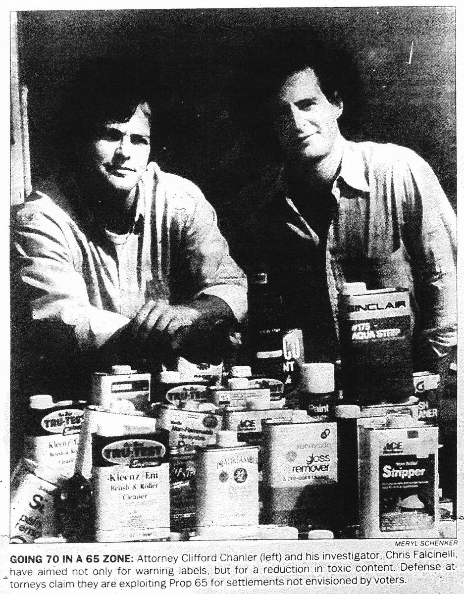 The defense fund then sent out notices of its intent to sue eight more manufacturers and distributors. Investigators for Chanler’s firm had traveled throughout California, purchasing cans of paint stripper and other methylene chloride products that did not contain Prop 65 warning labels.